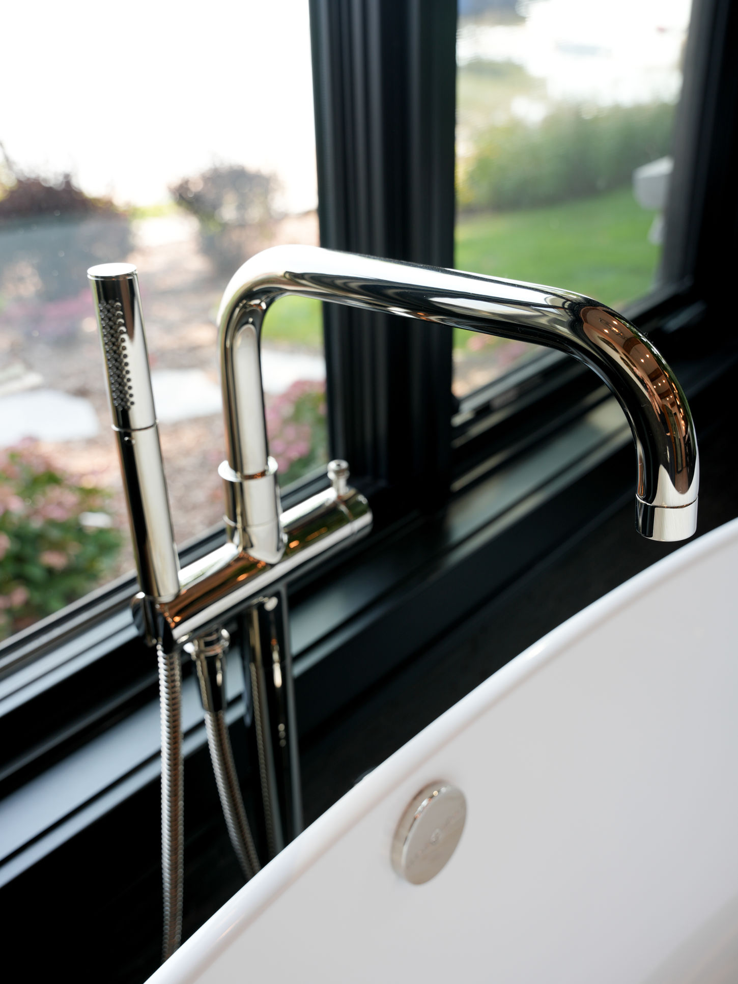 Our contrasting, sleek, kitchen design, complete with state-of-the-art appliances and a built-in cabinet with fridge, is a true chef’s dream. The spa-inspired bathroom, featuring a freestanding tub and custom shelving, offers a tranquil sanctuary. Every detail, from the thoughtfully designed spaces to the high-end finishes, captures the essence of modern living with a uniquely Northern Michigan twist.